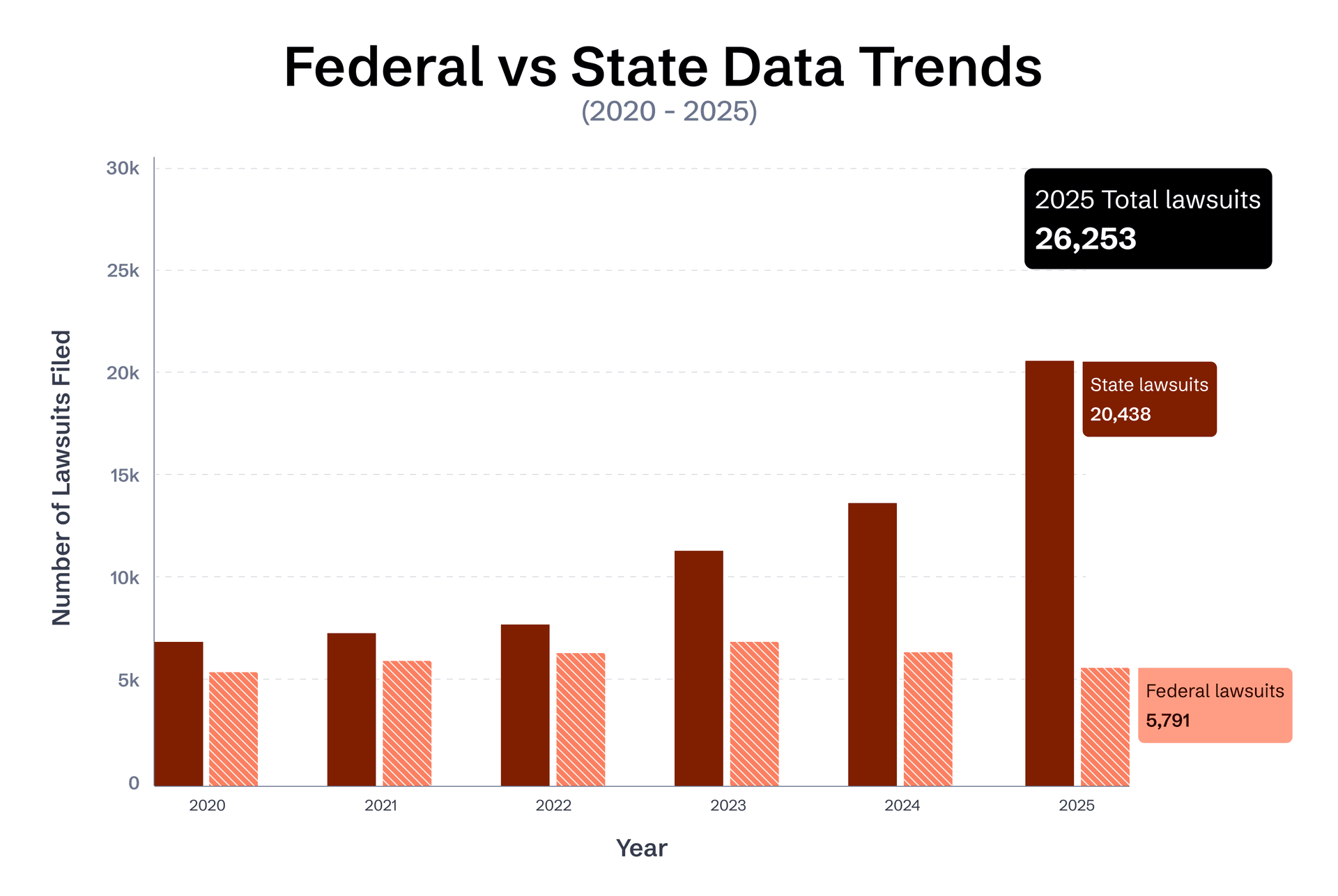 Federal filings may have plateaued since their 2023 peak of 6,722, but the total number of claims has doubled since 2020. The biggest change is where those cases are being filed. Nearly 8 in 10 lawsuits now originate in state courts.